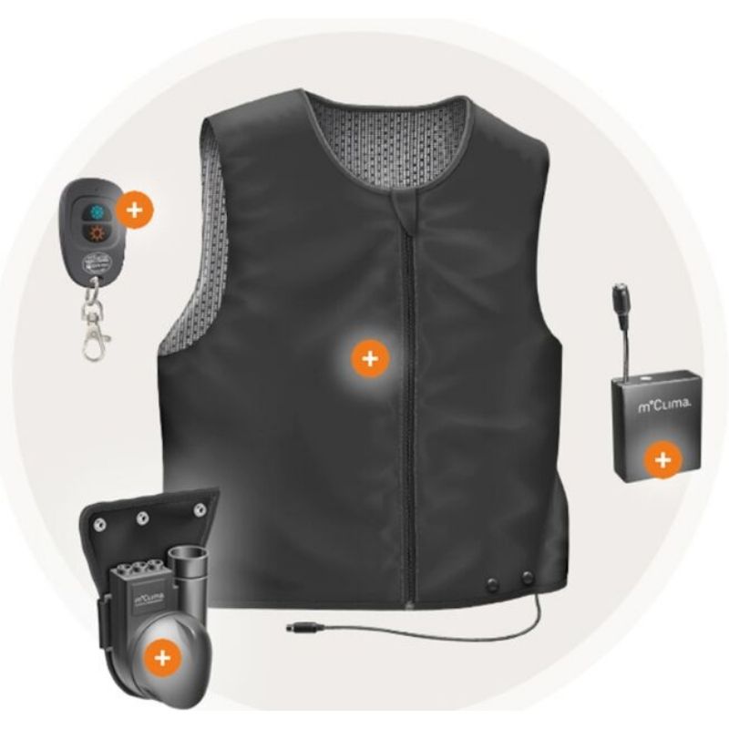 Knopfdruck auf der Fernbedienung. Der Lüfter zirkuliert dann frische Luft von außen durch die gesamte Weste und über die Haut